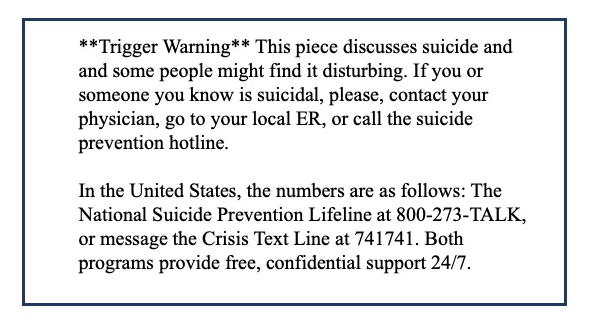 (Sorry, this got deeper than a response should have, but until others can begin to understand how to help anyone they suspect is in a “funk” of any kind, suicide will continue to happen.)