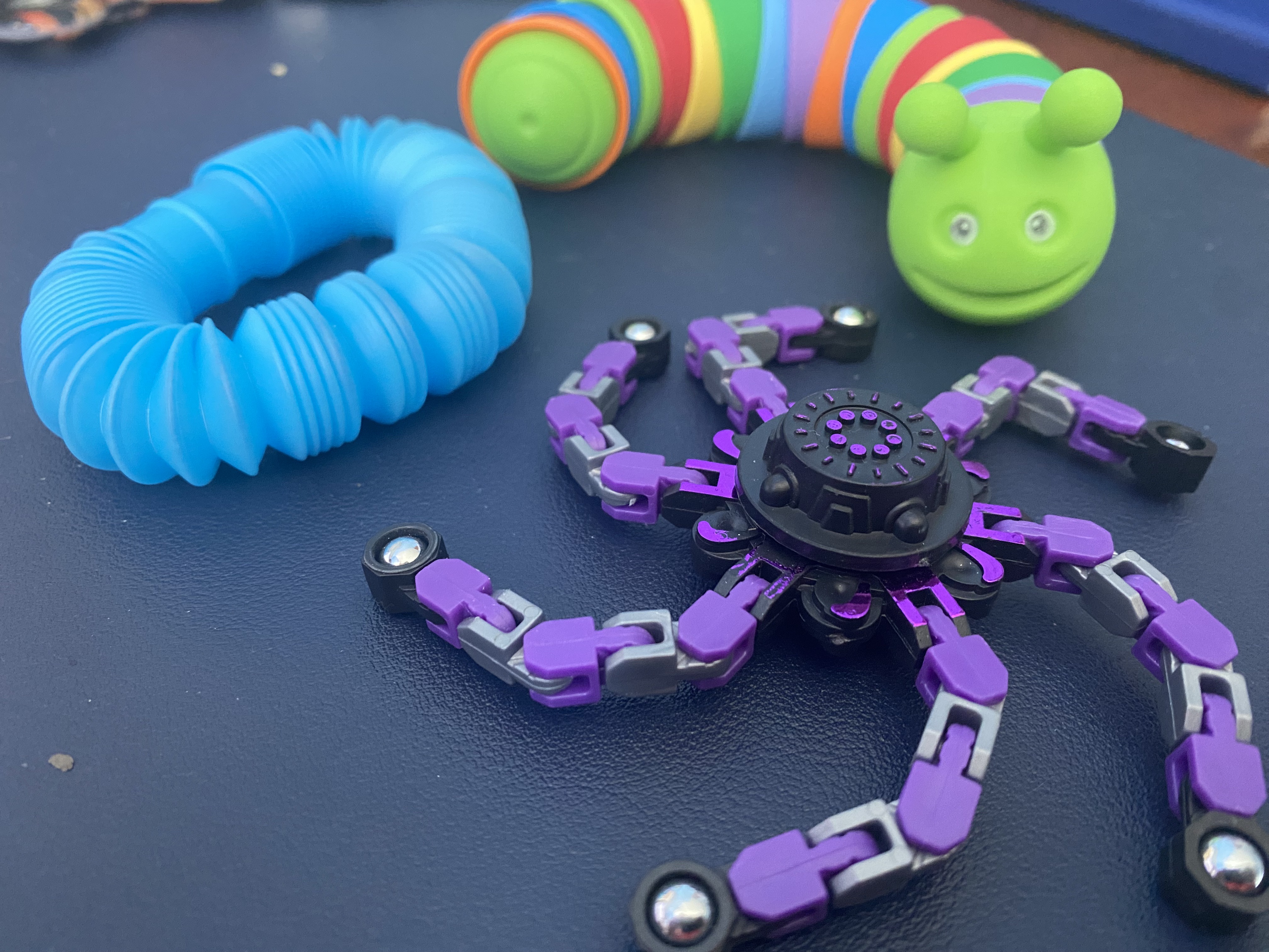 I collect stress toys and fidget spinners. You know the type, anything that you can play mindlessly with your hands to release nervous tension.
