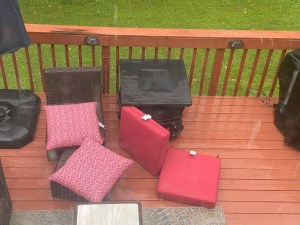 I tell him that my wife asked me to store the cushions to our deck furniture. We were expecting another rainstorm. We’ve been getting a steady stream of thunderstorms. However when a wee bit of sun managed to peek out of the clouds, we had pulled the cushions out. We knew the nice weather wasn’t going to last, but it was nice to take a break.