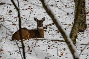 She was resting, but still on guard, ready to bolt if needed. In many ways the spot made perfect sense. The trees and bushes held cover. She could keep close tabs on everything around her. There was a small stream nearby. And with it being winter, there were plenty of twigs, buds, bark, and evergreens available for food.